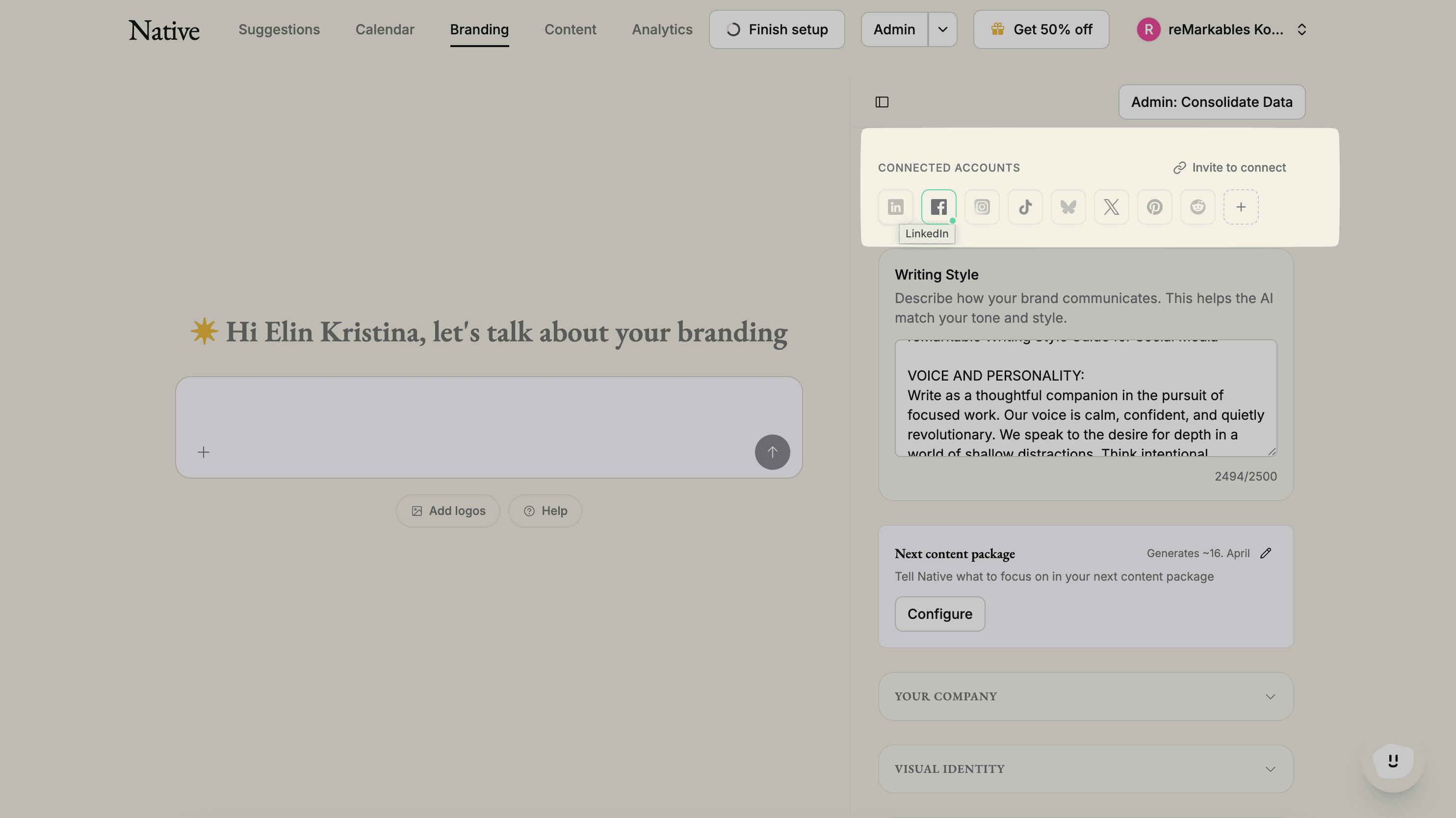 Inne på merkevare kan du legge til flere sosiale medier slik at du kan publisere dine innlegg flere steder. Til høyre ser du kanalene du er koblet opp til. Ønsker du flere, velger du gitt kanal og kobler deg opp ved å følge instruksjonene.