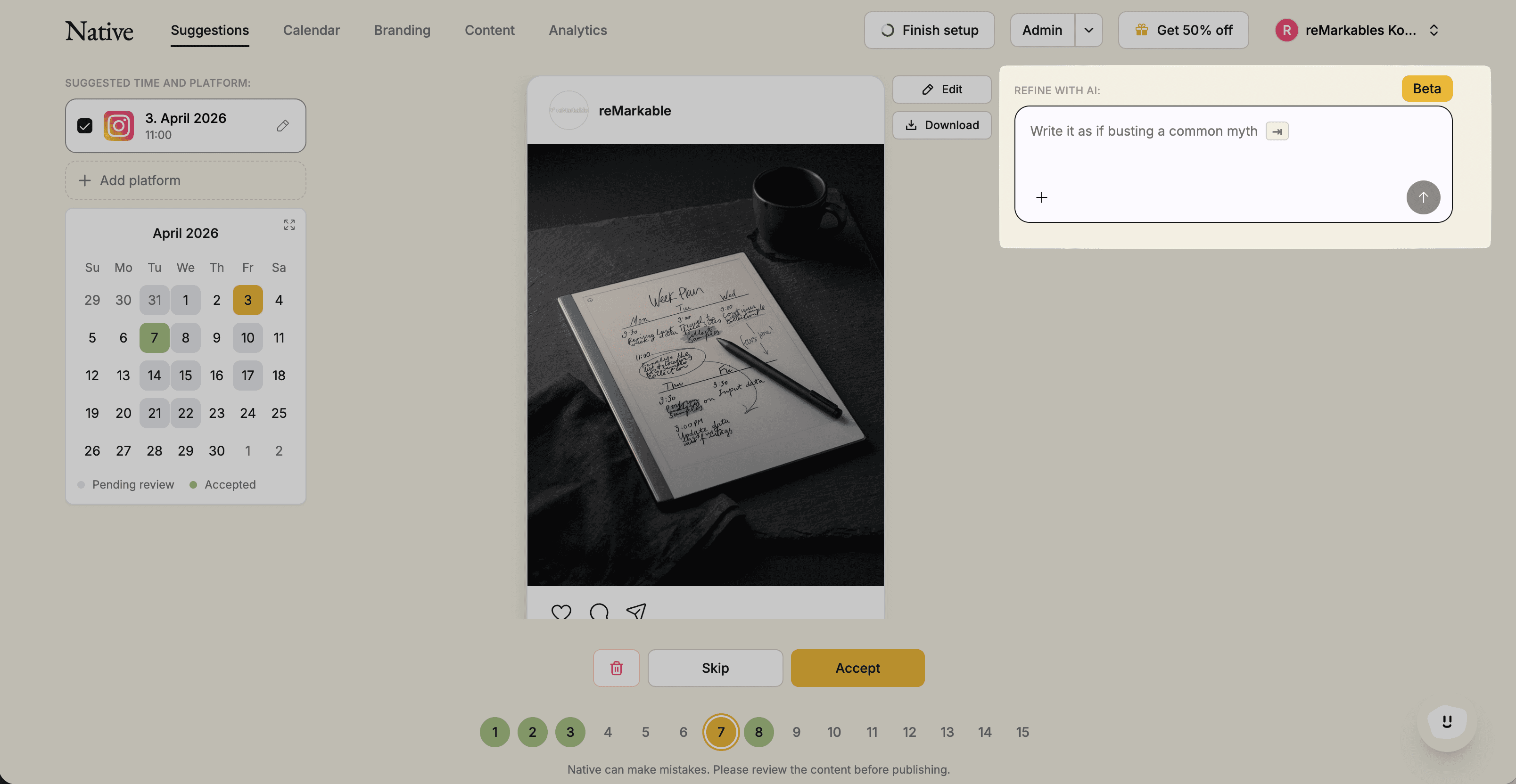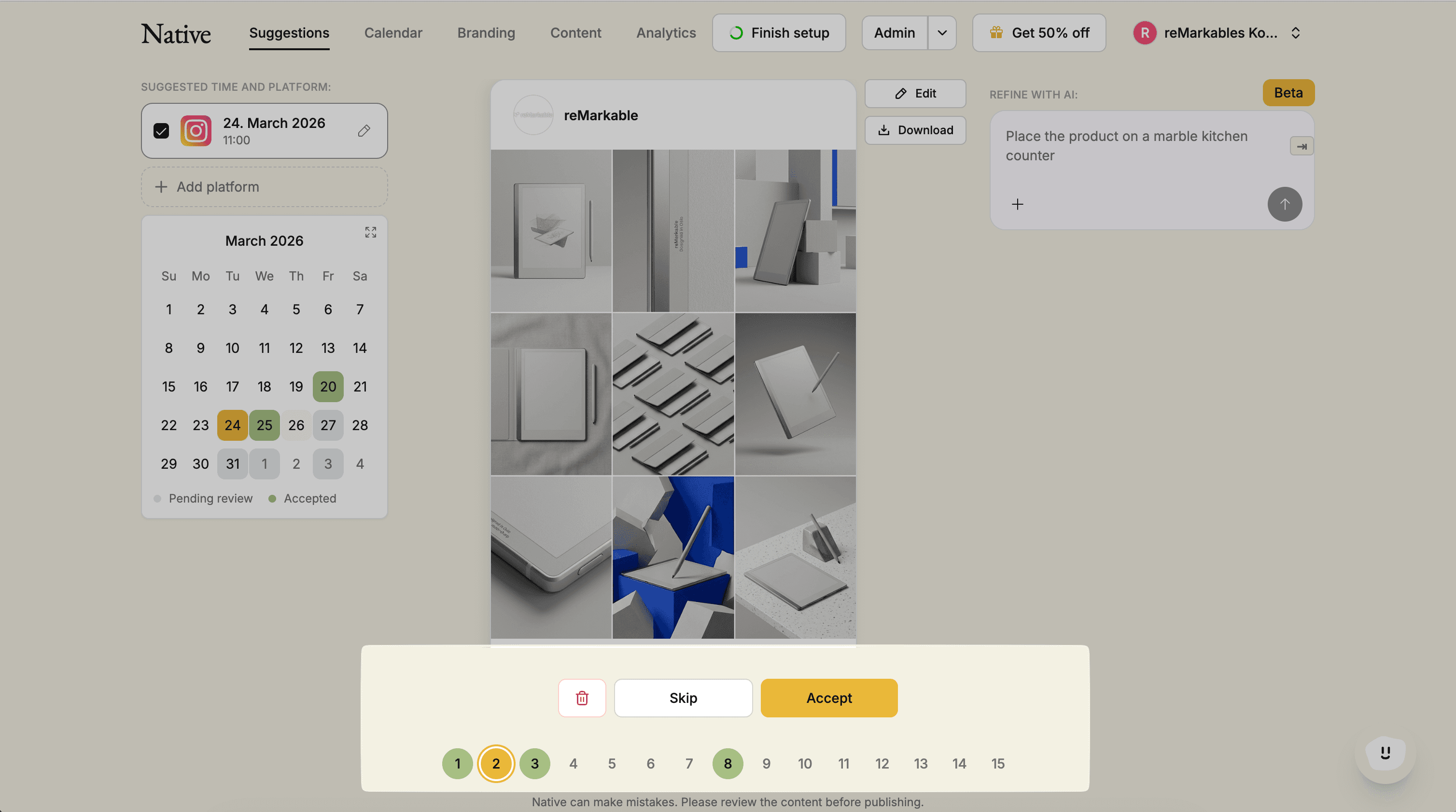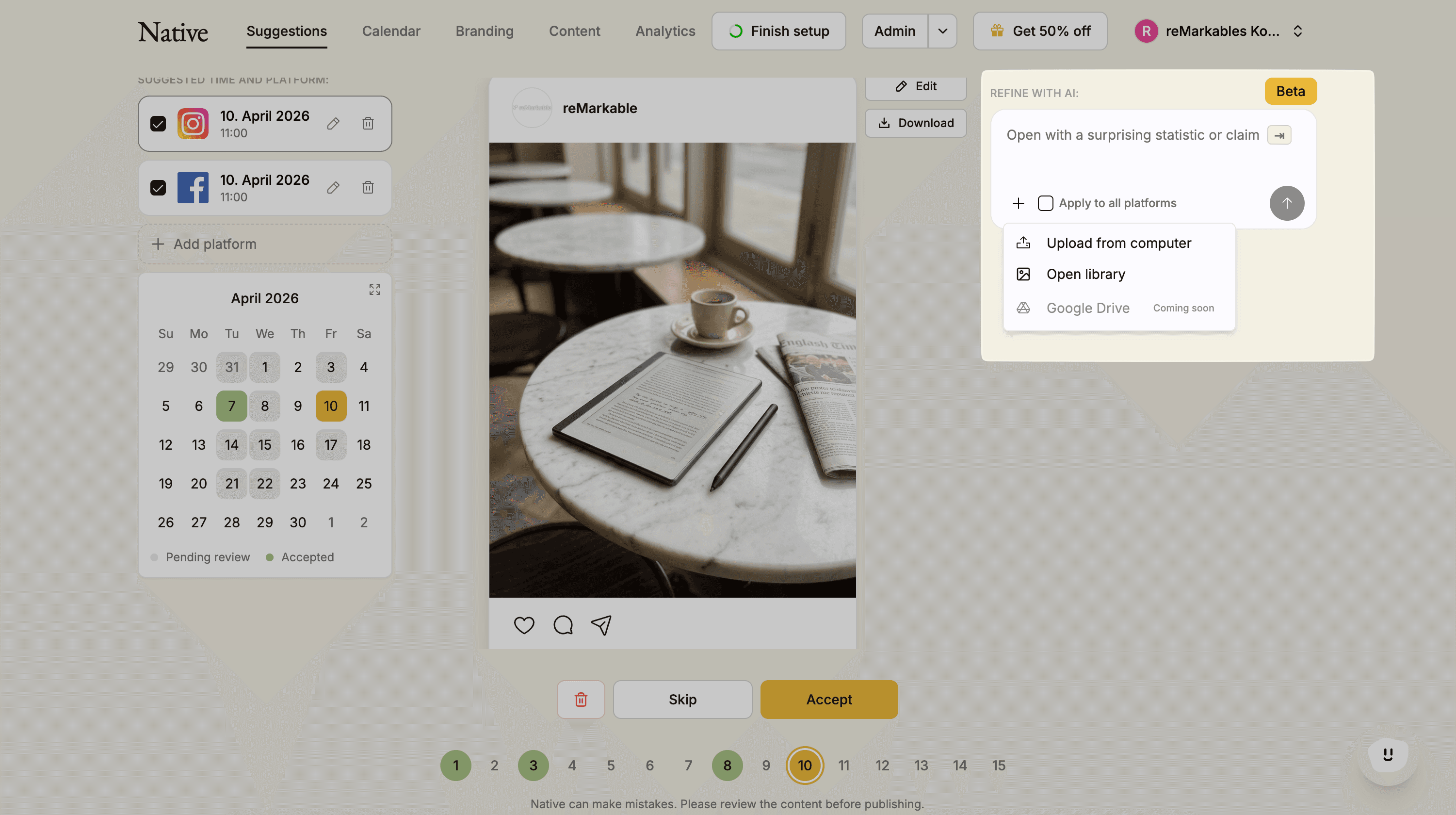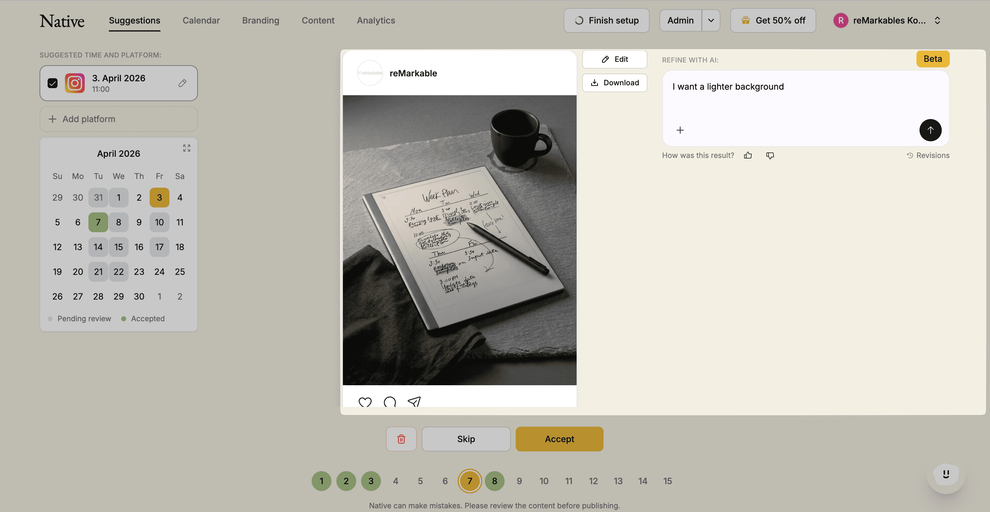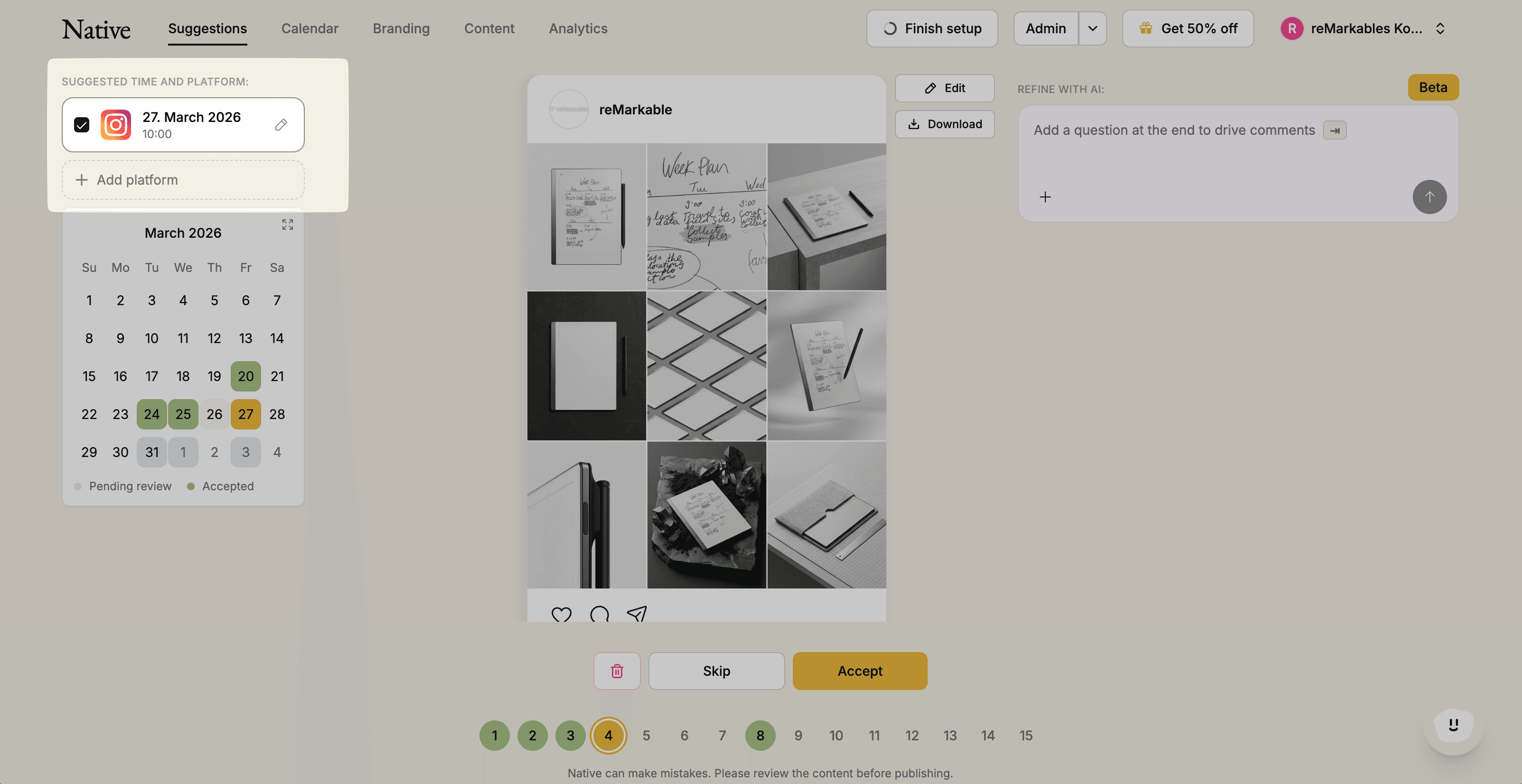 Inne under forslag finner du innleggene som er blitt laget av Native sin AI agent. Her kan du redigere, godkjenne og hoppe over innlegg du ikke er fornøyd med.